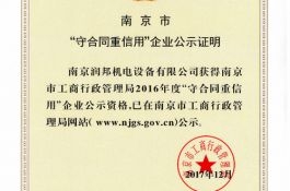 2017年12月29日,接到南京市企業(yè)信用管理協(xié)會通知,潤邦公司再次通過2016年度市級“守合同重信用”企業(yè)的認定。誠信潤邦,傾心服務。潤邦始終把合同管理、信用