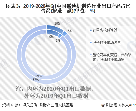 近年來,除“齒輪及其他變速、傳動(dòng)裝置:滾珠螺桿傳動(dòng)軸”外,其余產(chǎn)品的出口份額均有所下降。2020年第一季度,“齒輪及其他變速、傳動(dòng)裝置:滾珠螺桿傳動(dòng)軸”的出口額占到了中國(guó)減速機(jī)制造行業(yè)出口產(chǎn)品總出口額的89%。