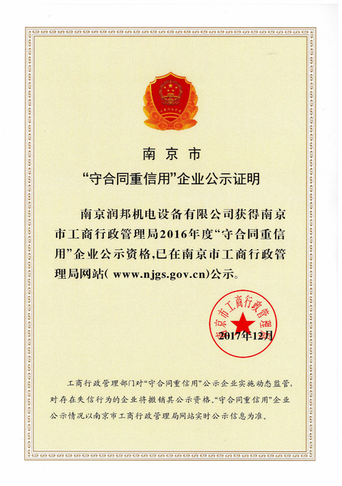 2017年12月29日,接到南京市企業(yè)信用管理協(xié)會通知,潤邦公司再次通過2016年度市級“守合同重信用”企業(yè)的認(rèn)定。