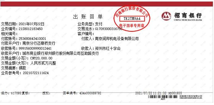 災(zāi)難面前,全國上下風(fēng)雨同行,同舟共濟。7月22日,潤邦公司決定盡我們的綿薄之力馳援河南,通過鄭州市紅十字會捐款人民幣兩萬元整,用于保障受災(zāi)地區(qū)人民群眾的生命安全、緊急救災(zāi)物資采購等,助力鄭州市防汛救災(zāi)工作。